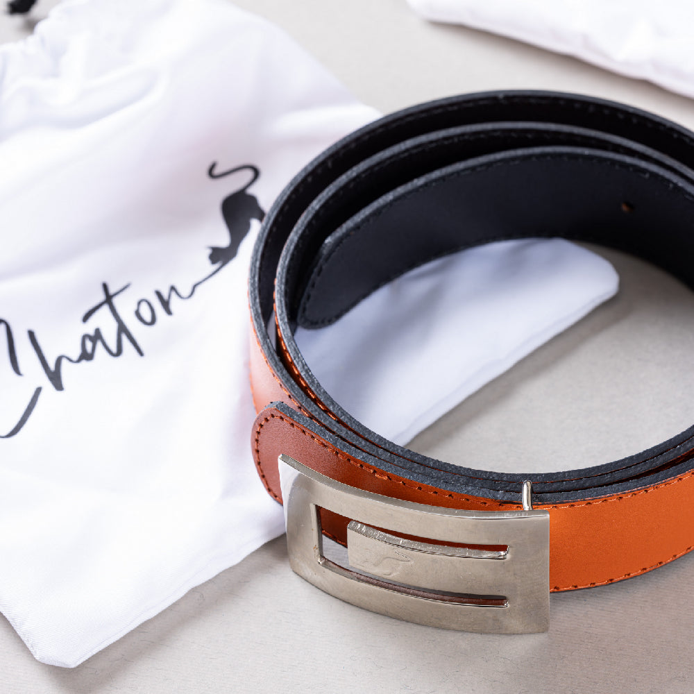 Have double the style with Chaton Reversible Leather Belt. This versatile accessory offers two fashionable looks in one, thanks to its clever reversible design. It features a sturdy brass buckle, adding a touch of sophistication to your outfit. The high-quality leather ensures durability and comfort, making it a practical choice for any occasion. Whether you prefer a classic or a modern look, the Chaton Reversible Leather Belt has you covered with its versatility and timeless charm.